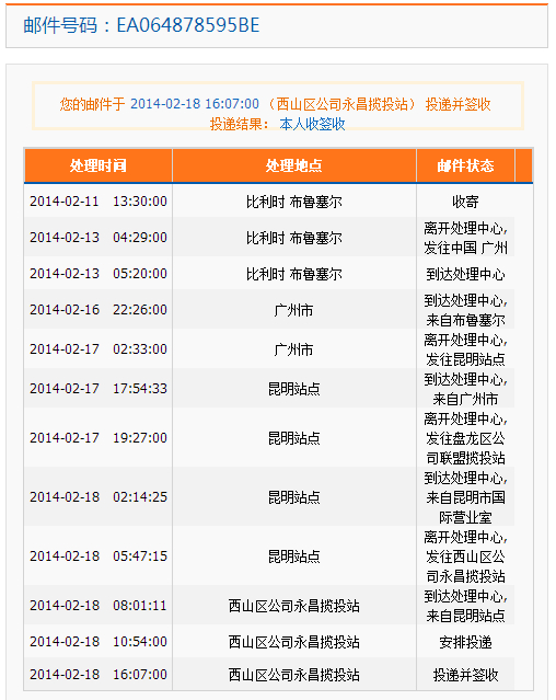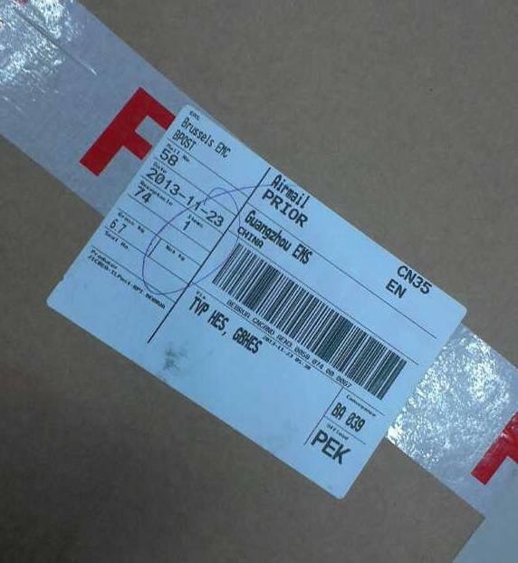 • 由于比利时邮政网站系统限制,即使是英国发出的包裹在快递网站也是显示比利时发出,不过在您收到包裹的快递标签上有航班号,能查验到是从英国发出,比如下图的BA039,BA是British Airway(英国航空)的缩写,BA039是伦敦发往北京的航班。